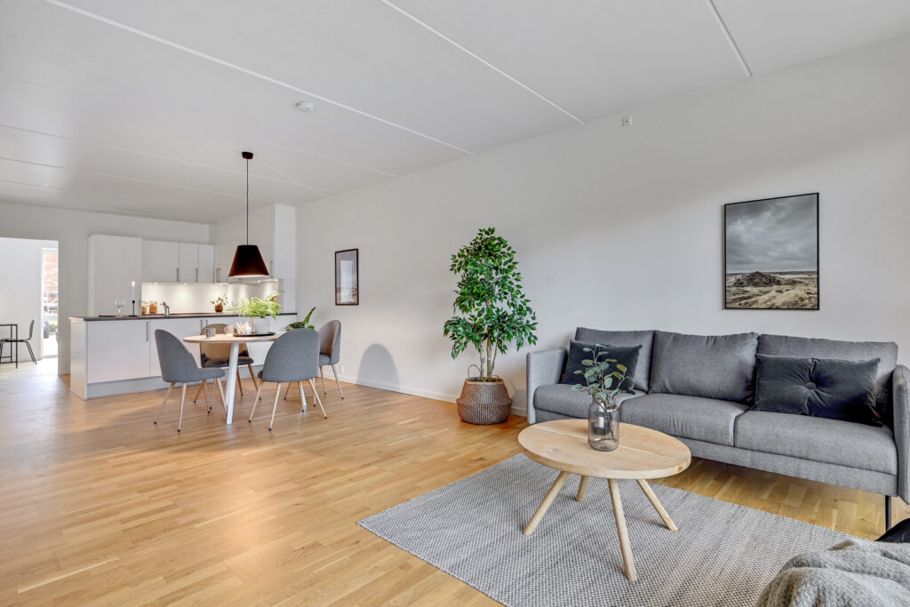 Denne bolig har rummeligt og åbent køkken. Her er installeret alt i hårde hvidevarer, her er godt med skabsplads samt gode materialer. Herfra er der forbindelse til god stor stue. Her er plads til både sofaområde samt spiseplads. Det er fra stuen at der er adgang til boligens terrasse.