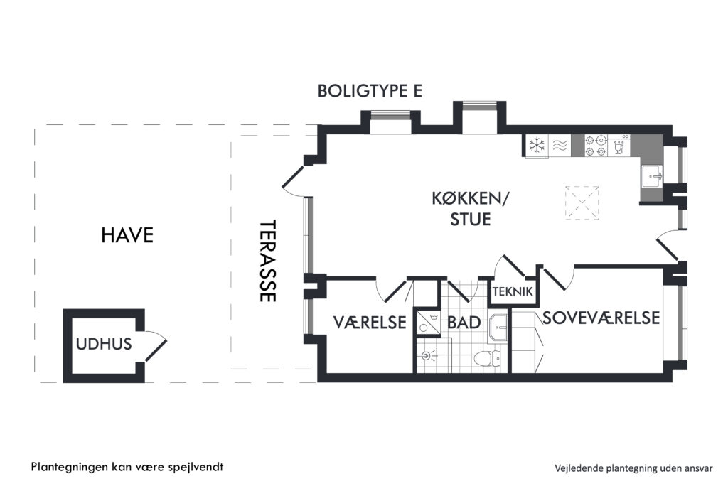 Her er rummeligt køkken alrum. Hvidt køkken med alle nødvendige hårde hvidevarer, og masser af skabs- og opbevaringsplads. Stuen har plads til både sofagruppe og spiseområde. Det er ligeledes herfra, at der er udgang til boligen store terrasse og have.