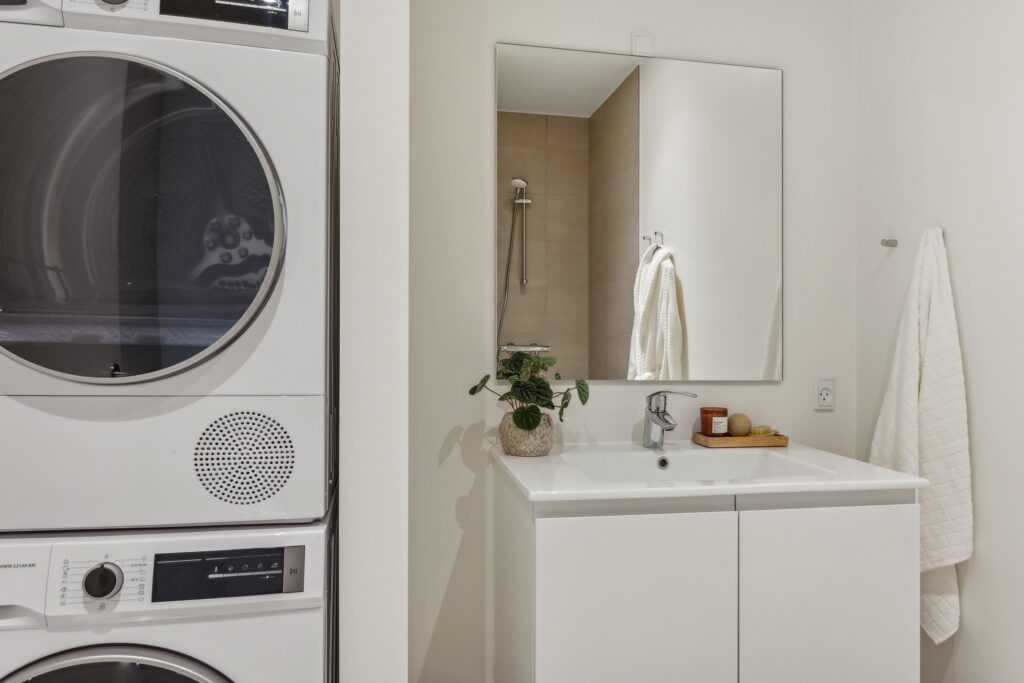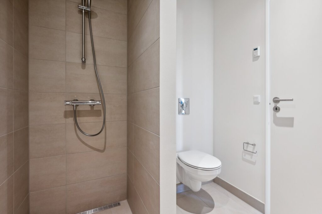 Badeværelset er som køkkenet, lavet i lyse materialer. Her er selvfølgelig installeret vaskemaskine og tørretumbler i alle boliger.