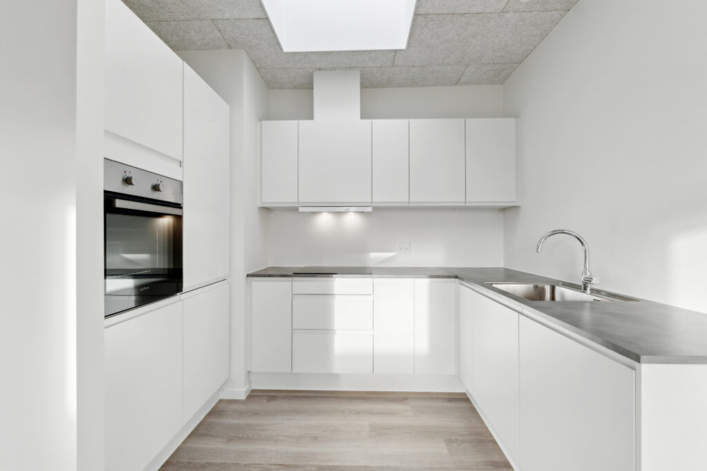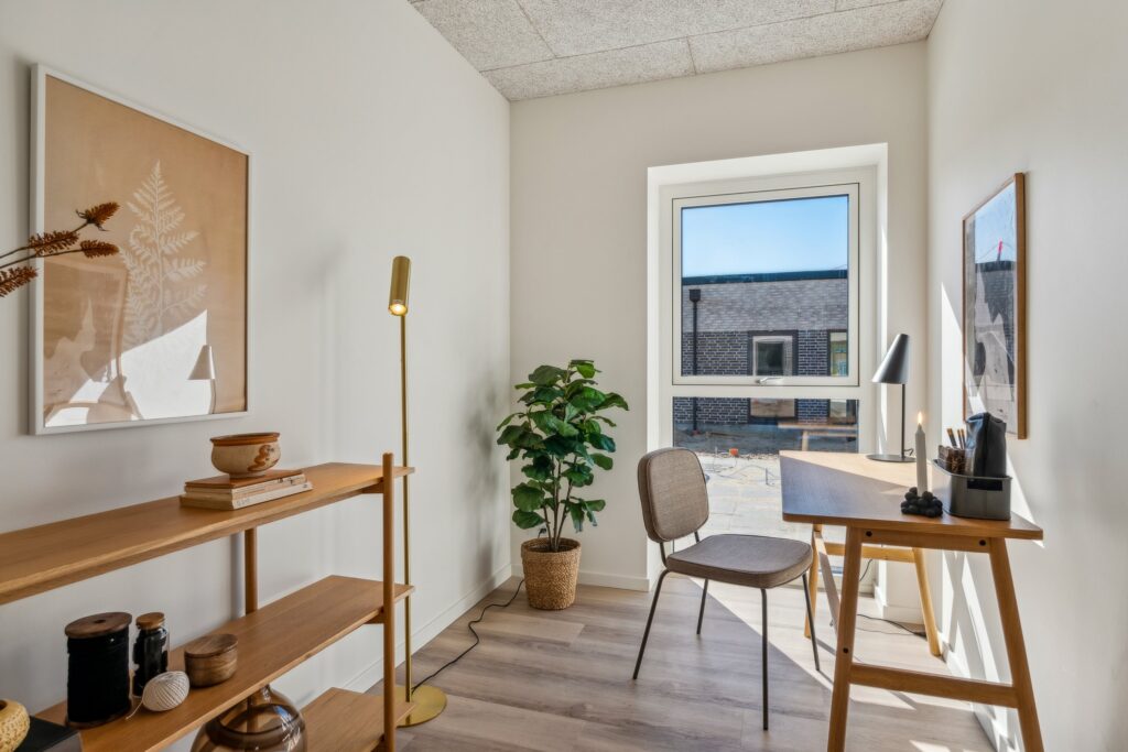 1 plans rækkehus beliggende i det skønneste område. Boligen har gulvvarme og ventilationssystem, der sørger for godt indeklima året rundt. Rækkehuset er udført i lyse materialer, både gulv, installationer samt loft er indbydende i god og slidstærk kvalitet.
