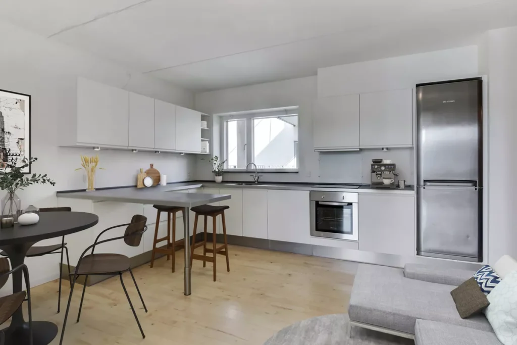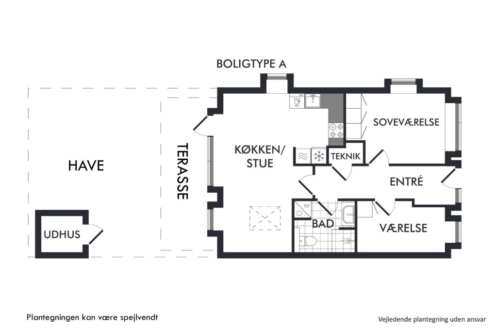 Her er rummeligt køkken alrum. Hvidt køkken med alle nødvendige hårde hvidevarer, og masser af skabs- og opbevaringsplads. Stuen har plads til både sofagruppe og spiseområde. Det er ligeledes herfra, at der er udgang til boligen store terrasse og have.
